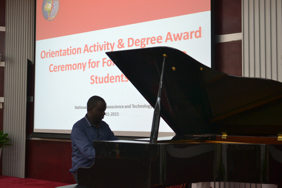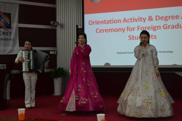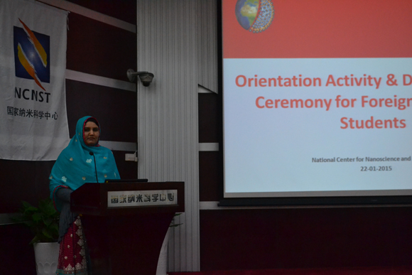 Students from Democratic People’s Republic of Korea sung a song in their own native language. Prof. Zhao awarded the degree certificate to graduate foreign students (Fahad, Deependra, Axel, Amita). Representative of graduate student Fahad shared his experiences of life at NCNST. Traditional Pakistani dance was performed by Pakistani student (Muzafar). A nice talk to boost up the new students was given by Prof. Chen Wang (Previous Director of NCNST). Peter played melodious piano and the milieu becomes magical. After the coffee break, Muhammad Safdar gave a speech on “Introduction to rules for foreign students at NCNST”. He said that the rules and regulations are the most promising building blocks of a disciplined society. All the new foreign Ph.D scholars of year 2015 introduce themselves in the orientation session.